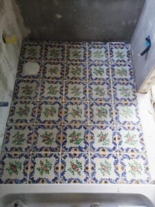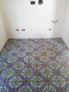 Lavoro interessante ed eseguito con la massima precisione, dopo aver realizzato il massetto abbiamo recuperato e incollato la marmetta di graniglia di cemento che era stata posata tra la fine del 1800 e inizio 1900, ridando vita ad antiche piastrelle dal valore inestimabile e ormai introvabili realizzate dalla storica Ceramica Marcantoni di Civita Castellana, manifattura per la produzione di ceramica artistica, d’uso e stoviglieria attiva a Civita Castellana, in provincia di Viterbo, a partire dall’inizio degli anni Venti, con una produzione di terraglie e porcellane negli stili moderni e tradizionali.