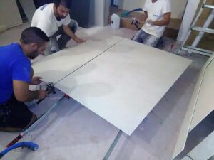 Il montaggio delle piastrelle in gres è avvenuto con grande attenzione e con l’ausilio di speciali ventose, ideali a garantire l’integrità di queste particolari piastrelle dallo spessore di soli 6 mm.