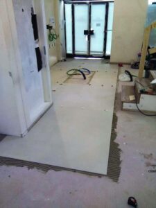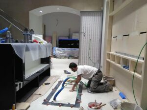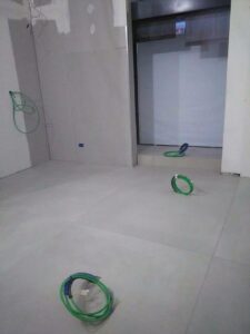 Abbiamo proceduto prima con la demolizione della precedente pavimentazione, rifatto le tracce e il sottofondo con massetto pronto ed autolivellante ed una fascia nera di isolamento pronta ad accogliere le piastrelle.