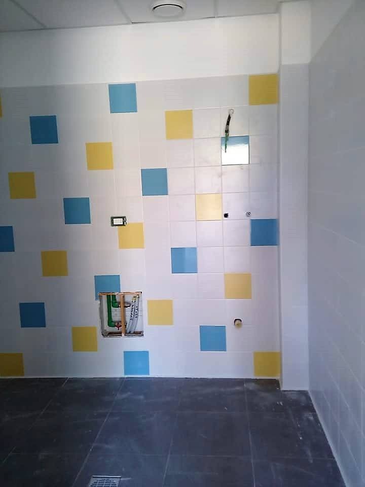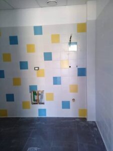 Abbiamo provveduto alla posa in opera di un pavimento antiscivolo, che garantisce una maggiore sicurezza per i bambini, e di un rivestimento alle pareti con piastrelle colorate che donano all’ambiente un aspetto allegro e vivace. Questo lavoro è stato eseguito con maestria, come sempre, ma questa volta con un qualcosa in più, con la voglia di creare un ambiente confortevole e piacevole dove i bambini possano crescere e giocare insieme in tutta sicurezza.